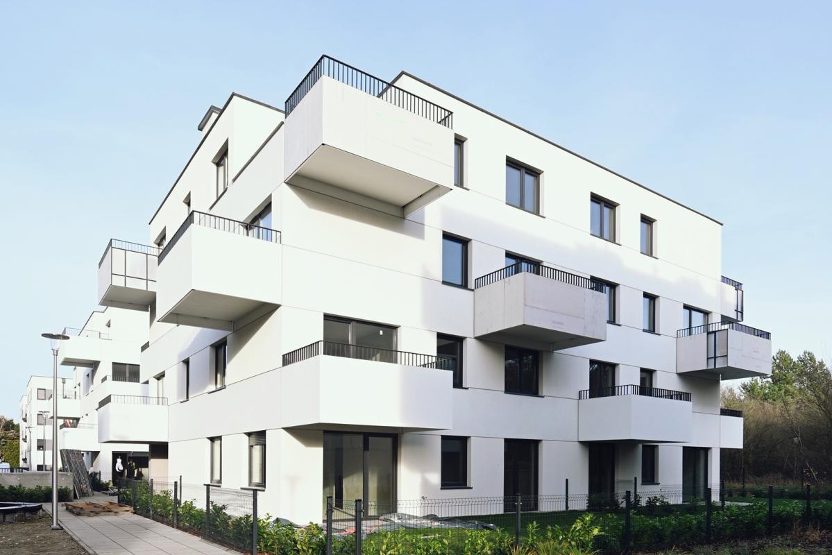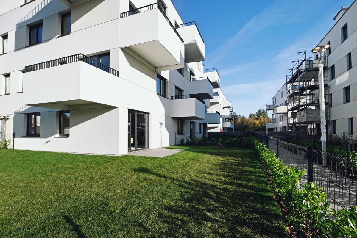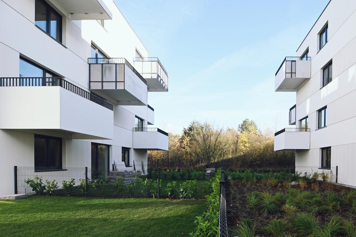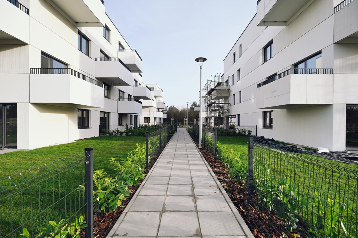 Szlachetna biel elewacji budynków osiedla No To Naramowice pięknie kontrastuje z otaczającą je zielenią.